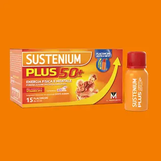 Sustenium Plus 50+ è un integratore alimentare energizzante con una formulazione specifica per adulti 50+ in pratici flaconcini, a base di vitamine B (tra cui la B12 ad alto contenuto), magnesio e complesso antiossidante Actiful®.